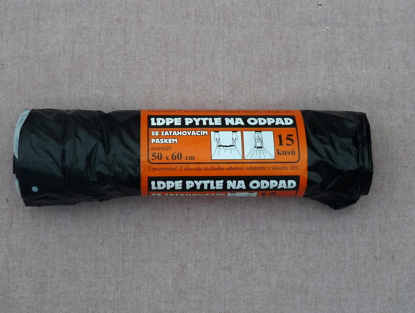 Polyetylenový pytel 50x60 černý á 15 ks se zatahovacím páskem. Karton = 30 rolí